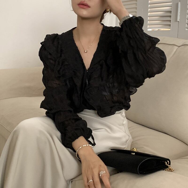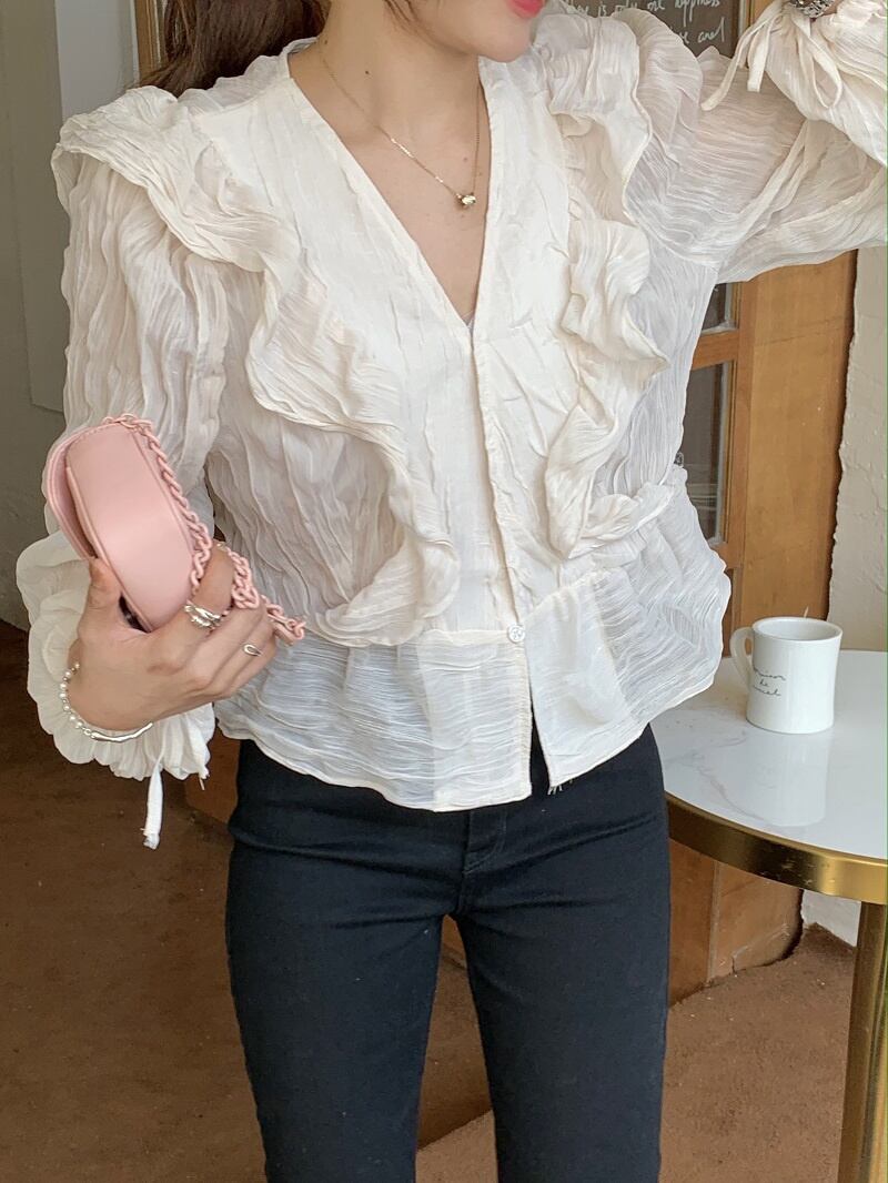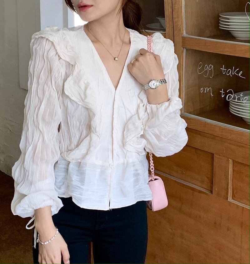 2023春INS★カジュアル 気質 Vネック プリーツ フリル パフスリーブ シャツ/ブラウス