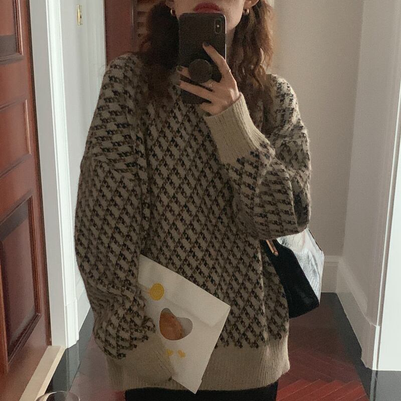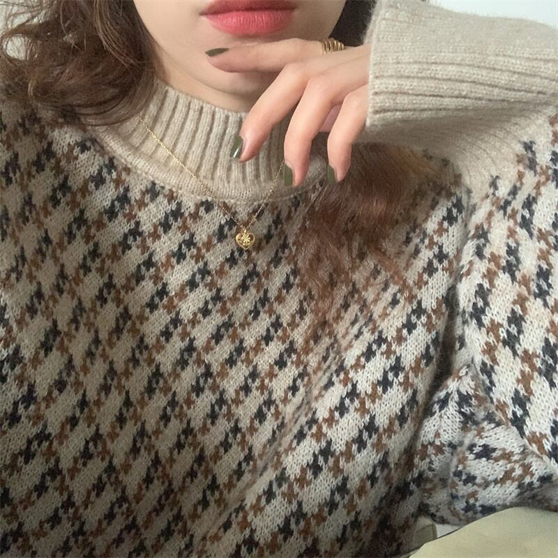 2022冬INS★韓国風 レトロ デザイン感 立ち襟 チェック 幾何様子 ニットセーター