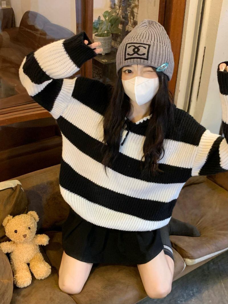 2022冬INS★韓国風 レトロ 帽子付き ストライプ 柄 ニット セーター