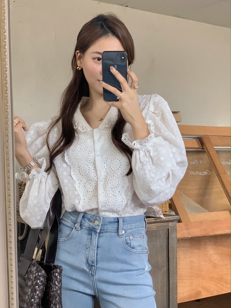 2023春INS★カジュアル 気質 透かし彫り シングルブレスト パフスリーブ シャツ/ブラウス