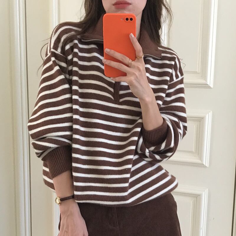 2022冬INS★韓国風 レトロ デザイン感 折り襟 チャック ストライプ 柄 ニットセーター