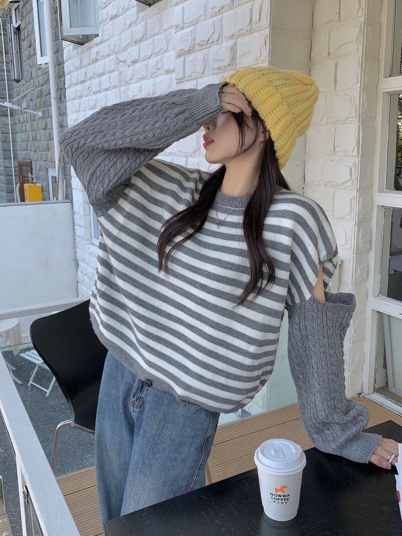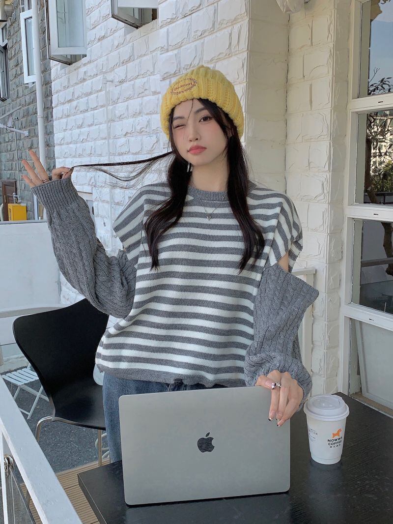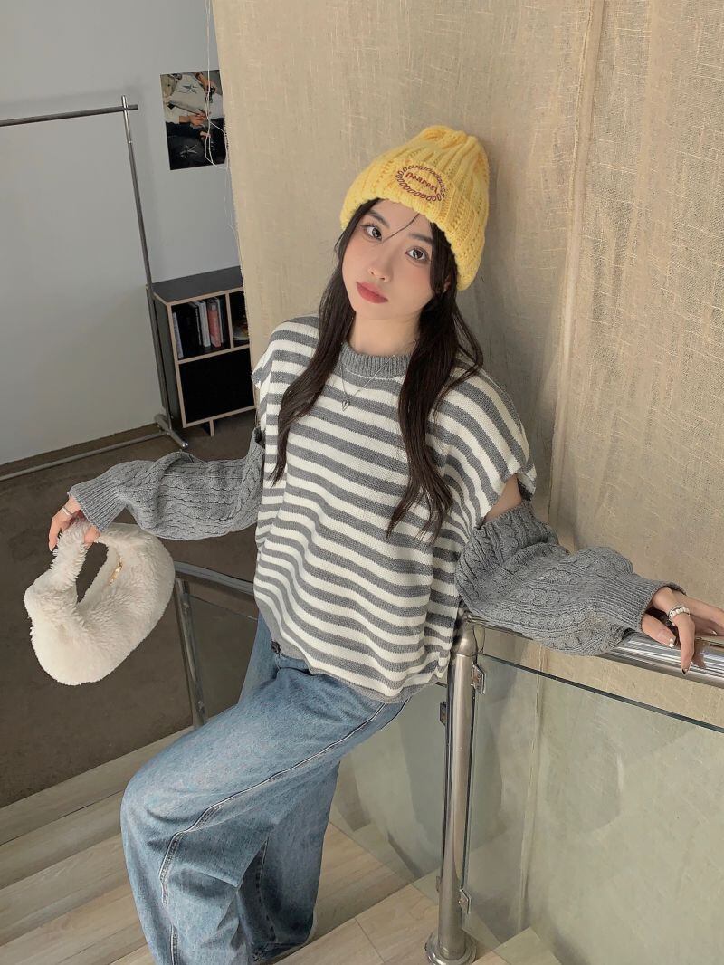 2022冬INS★韓国風 デザイン感 スプライス オフショルダー トップス 長袖Tシャツ