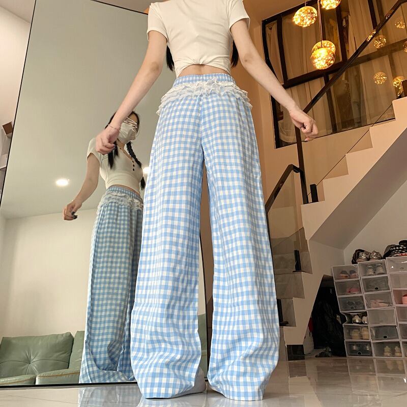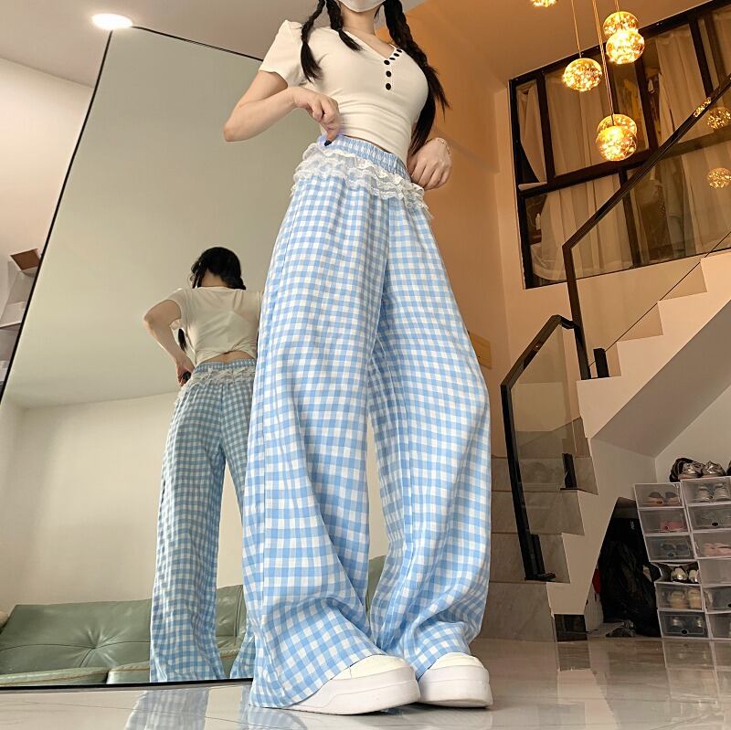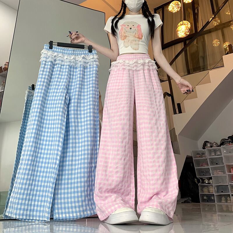 全2色 ワイド バギーパンツ 切り替え バイカラー 体型カバー 着痩せ チェック柄 sweet系