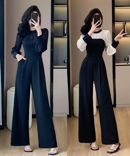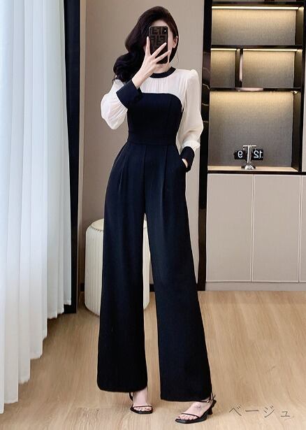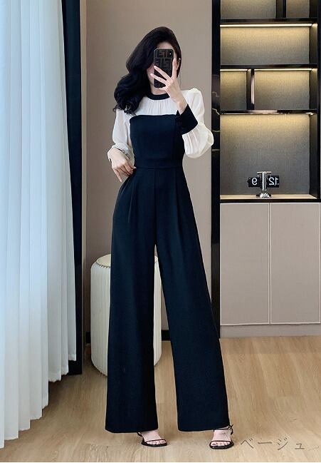 全2色 オールインワン オーバーオール 切り替え スリム 着痩せ 【大きいサイズあり】