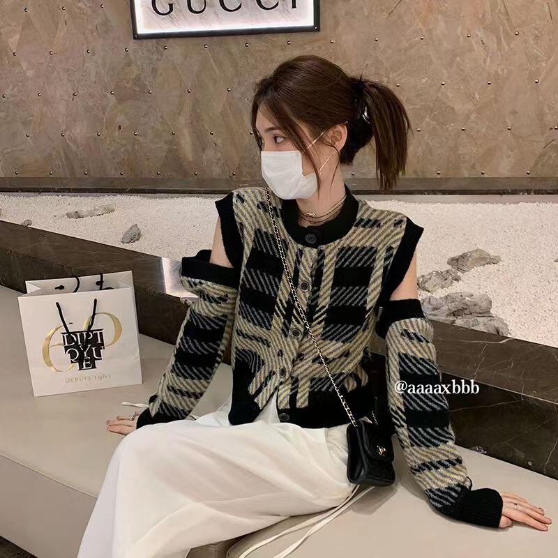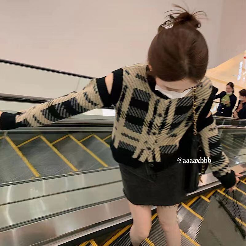 2022冬INS★韓国風 オープンショルダーチェックニット セーター