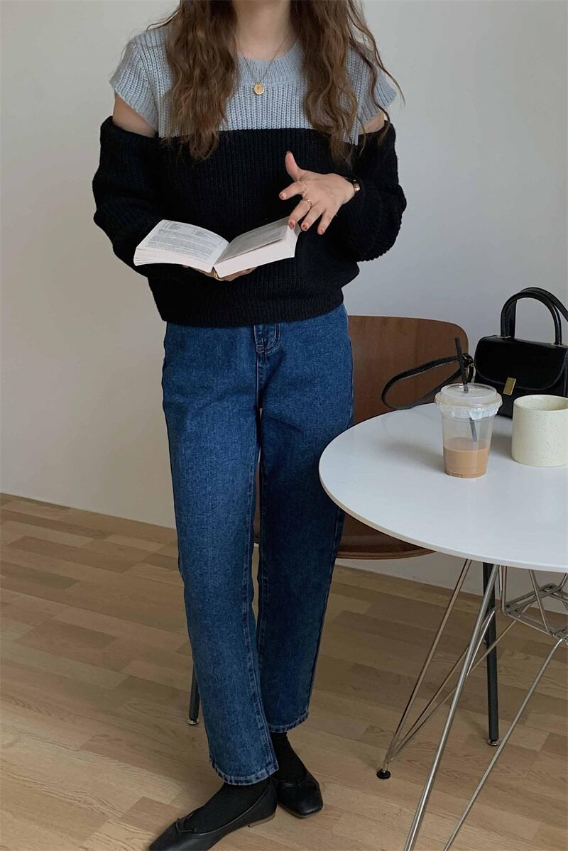 2022冬INS★ファッション超気質 韓国風 ニット スプライス 配色 オフショルダー セータ