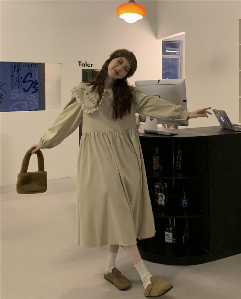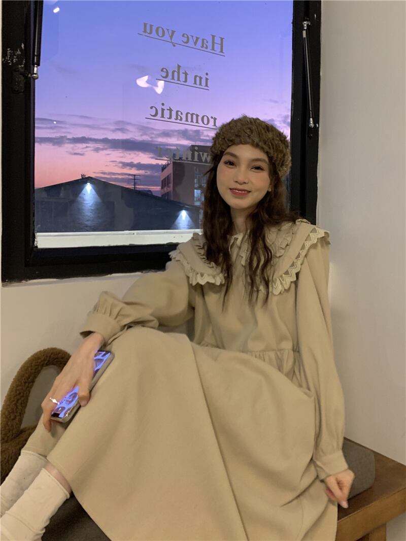 INS 秋新作 カジュアル 韓国系 折り襟 長袖 レース飾り ゆったり ロングワンピース