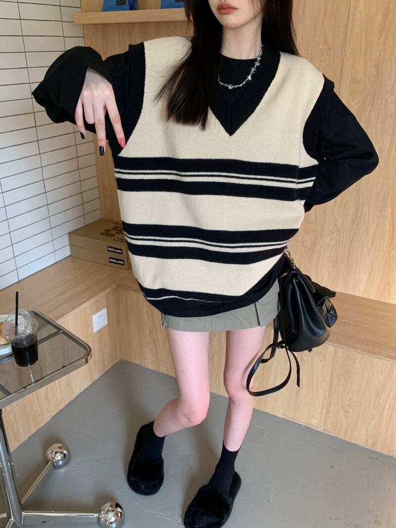 INS 秋新作 超人気 韓国系 Vネック ストライプ 柄 レトロ ベスト