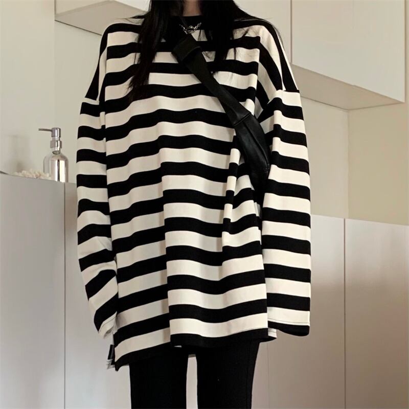 INS 秋新作 超人気 韓国系 シンプル ストライプ 柄 ラウンドネック 長袖 Tシャツ