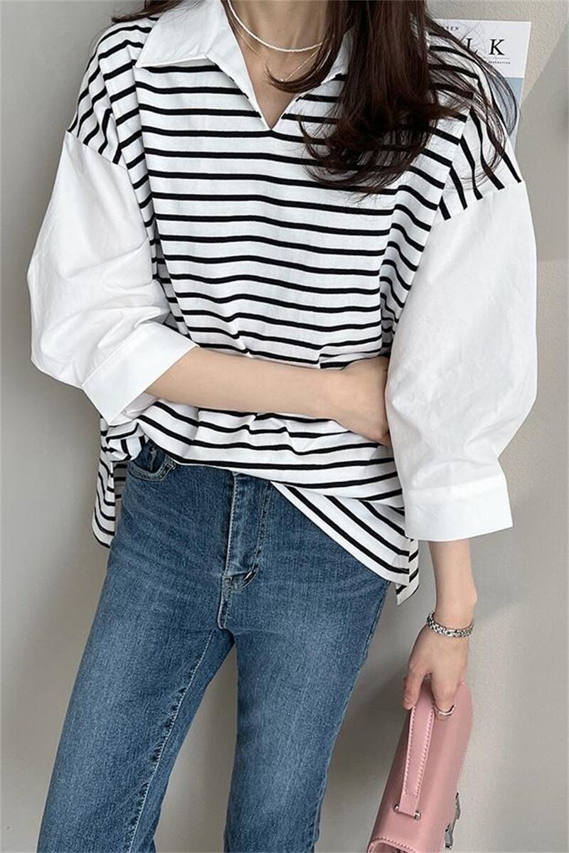 INS 秋新作 超人気 合わせやすい 偽2枚 poloネック スタライプ柄 5分袖シャツ