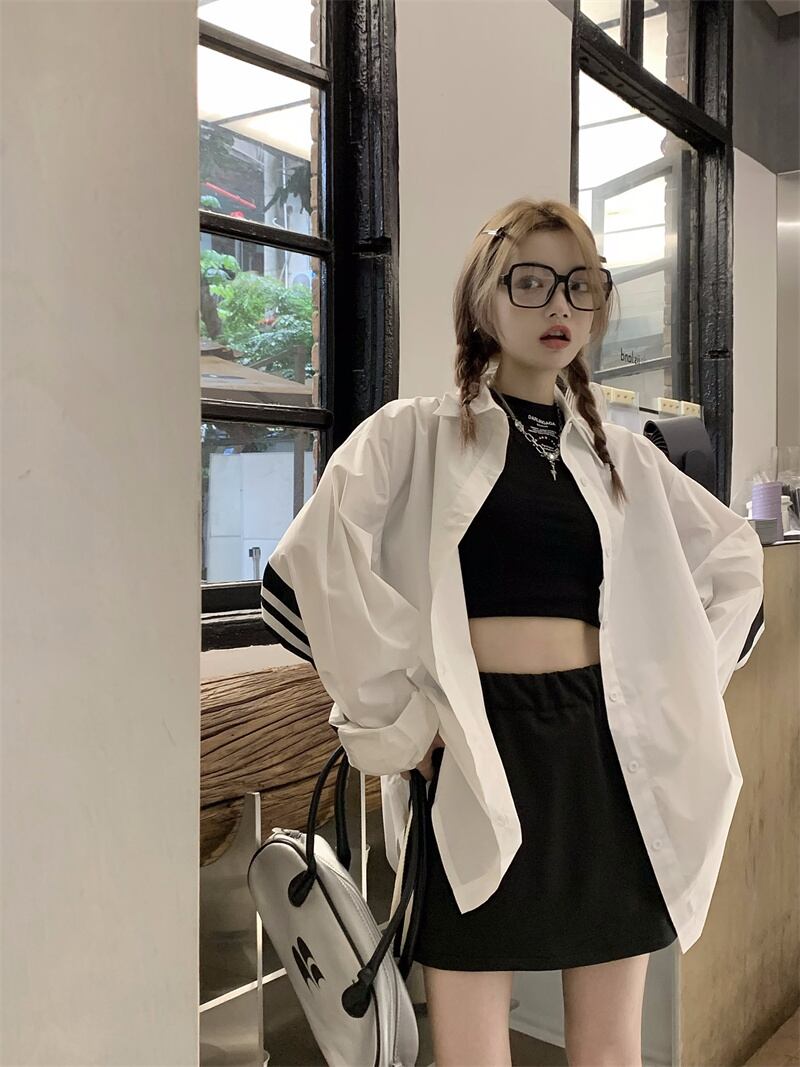 INS 秋新作 カジュアル デザイン ゆったり ストライプ 柄 ロング シャツ