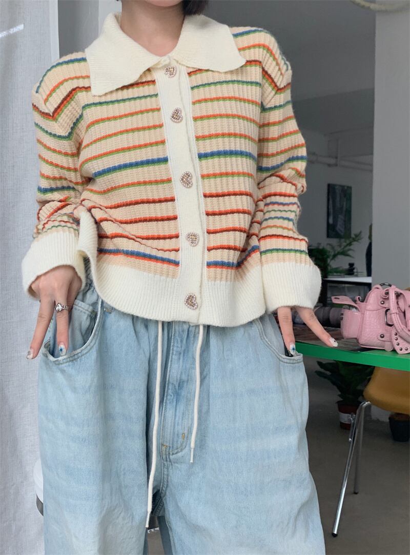INS 秋新作 超人気 韓国系 ストライプ 柄 折り襟 ニット セーター