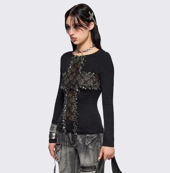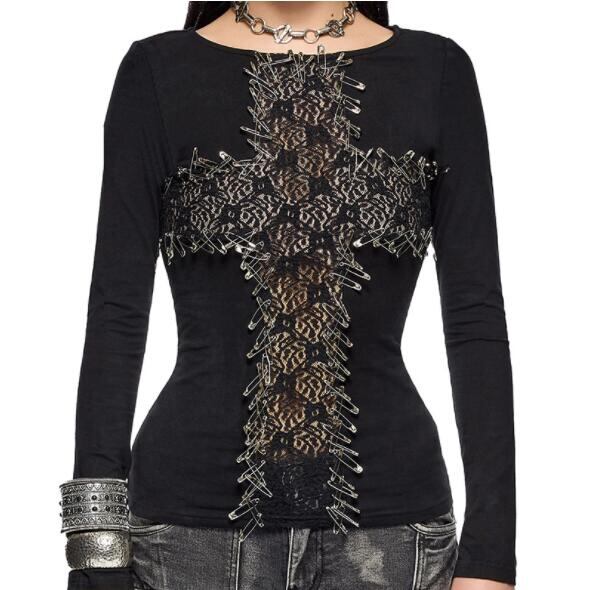 トップス Tシャツ ブラウス スリム 長袖 レース 暗黒系