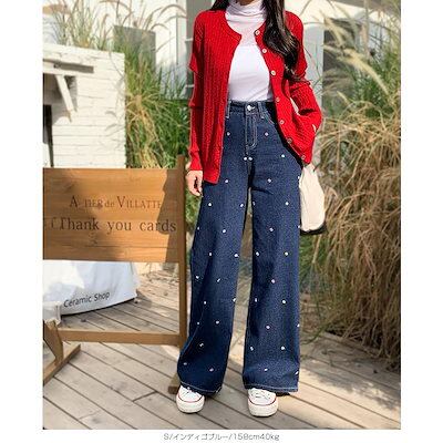 即?刺しゅう小花柄ワイドデニムパンツ ワイドパンツ 股上深め レディース ゆったり 体系カバー 着痩せ 美脚 ストレート 脚長効果 大きいサイズ 小さいサイズ