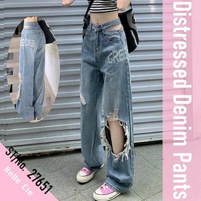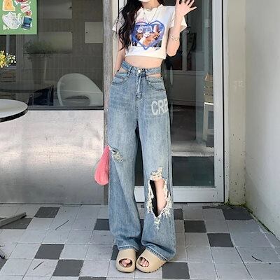 即納ありデニムパンツ レディース ダメージデニム 破れ加工 ルーズ ゆったり かっこいい ギャル カジュアル ストリート ダンス 衣装 かわいい ロング 肌見せ