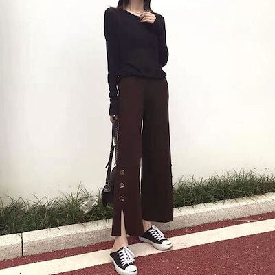 即納ありニット ワイドパンツ レディース フレアパンツ リラックスパンツ ストレッチ ボトムス 伸びる ゆったり スリット