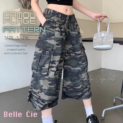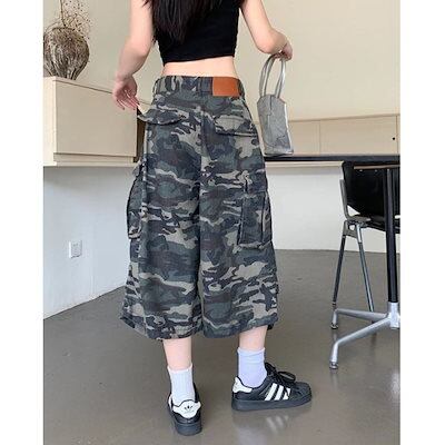 即納ありカーゴパンツ ハーフパンツ ボトムス ワイド 迷彩 ストリート レディース 韓国ファッション ゆったり ミリタリー クロップド アウトドア カモフラ