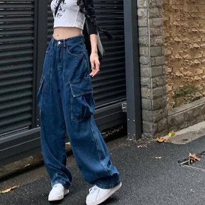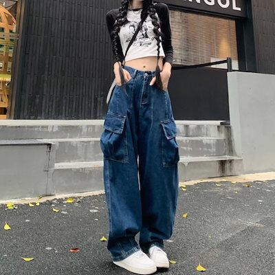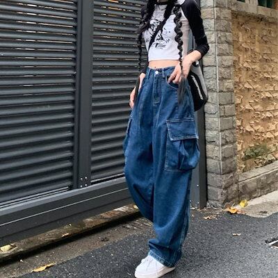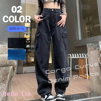 即納ありカーブパンツ レディース ワイド ジーンズ ストレート デニム カーゴパンツ デニムパンツ ハイウエスト ズボン 韓国ファッション ゆったり ルーズ