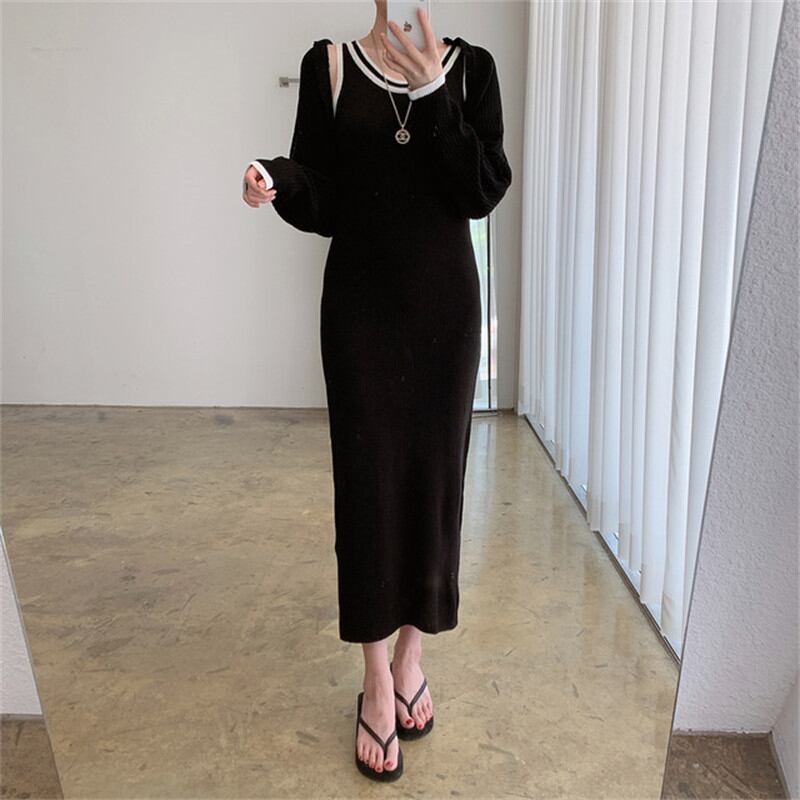 秋INS 新作 レトロ 着瘦せ 体型カバー 長袖 ニット生地 配色 ミニ丈 カジュアルセットアップ