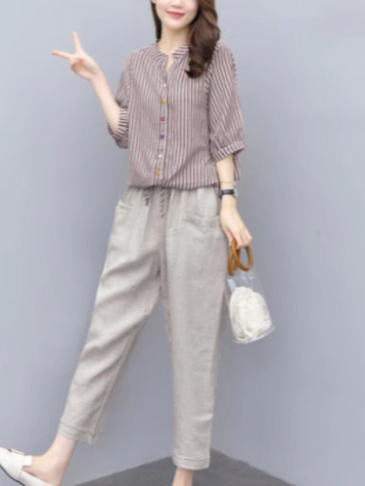 初回送料無料 ストライプ上着と9分のズボン2点セット レーディスファション商品 人気セットアップ