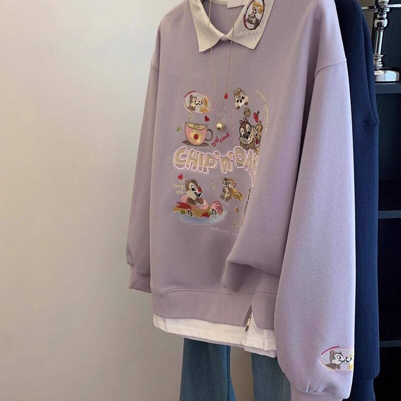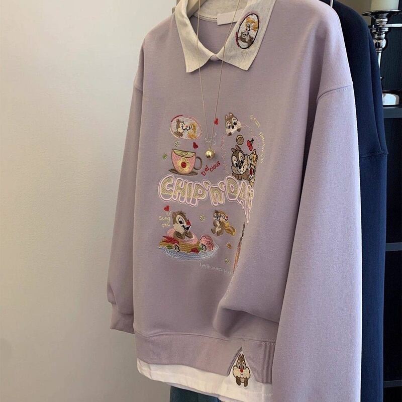 トレーナー ポロ襟 重ね着風 刺繍 レトロ カジュアル 長袖 レディース 秋