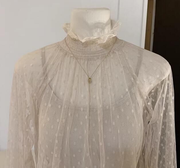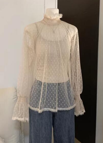 スリム レースアップ フリル トップス 透け感メッシュ ランタンスリーブ