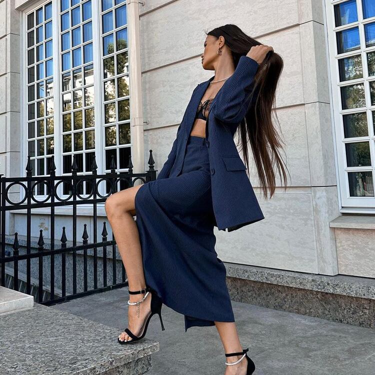 買って良かったです シンプル縦ストライプ カジュアルジャケット スリットデザインスカート 2点セット