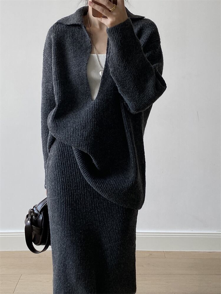 限定数量セール 秋のゆったり感 深Vネックセット ニットロングスカート ハイウエスト カジュアルウェア