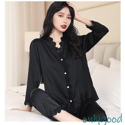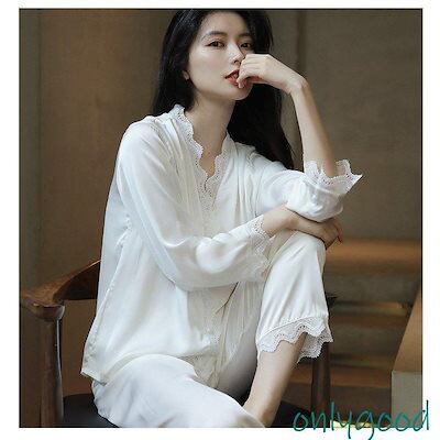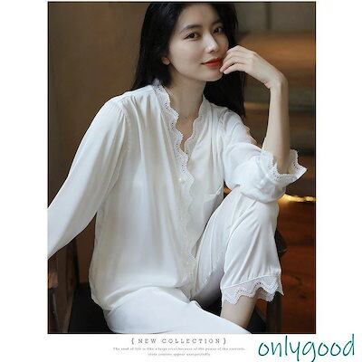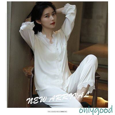 パジャマ ルームウェア レディース 春夏秋 長袖 パジャマ 前開きルームウェア レースVネック レション ロングパンツ上下セット 大人可愛いパジャマ 女性 部屋着