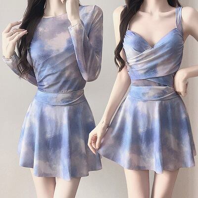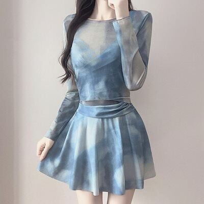 水着 レディース ワンピース スカートタイプ ハイセンス タイダイ 長袖 カーディガン 2点セット お肉カバー 保守的 お腹カバー