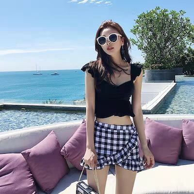 高級な質感 水着 レディース 体型カバー 2点セット 上下 ママ水着 ビキニ ミニスカート UVカット 着痩せ 可愛い 温泉 海水浴 水泳 黒 新作