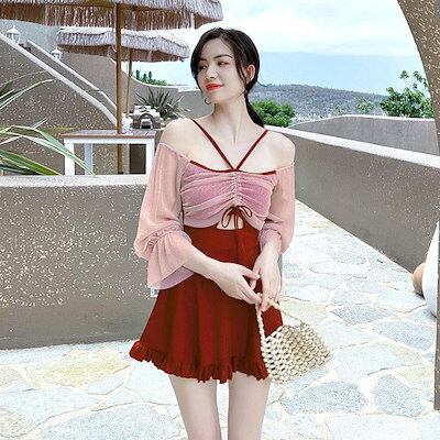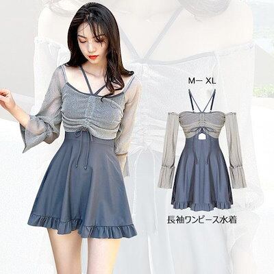 水着 レディース 体型カバー 水着ワンピース型 サロペット水着 長袖 UVカット 肩出し 小胸バンドゥ オシャレ可愛い スイムウェア 学生 ラッシュガード ビーチ