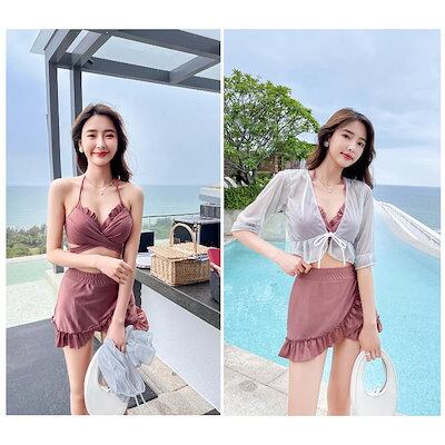 水着 レディース 3点セット 夏 小胸 バンドゥ パレオ リゾート パッド付き 体型カバー UVカット ママ水着 海水浴 潜水 韓国風 可愛い 20代 30代 40代