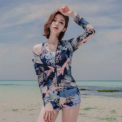 ラッシュガード 水着 レディース 長袖 3点上下セット フィットネス水着 体型カバー セパレート かわいい 大きいサイズ ショートパンツ パーカー ママ水着 オトナ女子 カバーアップ UVカット フィ