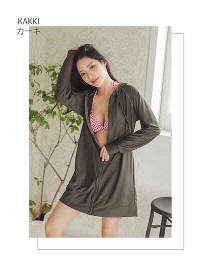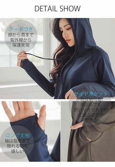 ラッシュガード レディース UVカット パーカー おしゃれ 水着体型カバーラッシュパーカー ロング 薄手 伸縮性 日焼け防止 フード付き フルオープンジップ ティアード 指穴 パーカー ポケット付き