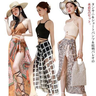 水着 タンキニ 3点セット レディース ビキニ バンドゥ ショートパンツ パレオ付き ママ水着 体型カバー 露出控えめ お尻 太もも カバーアップ 女性 大人 代 30代 40代 スイムウェア 海