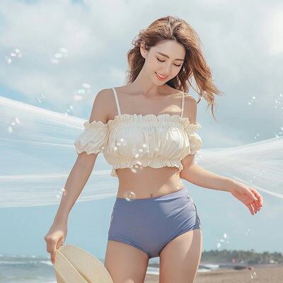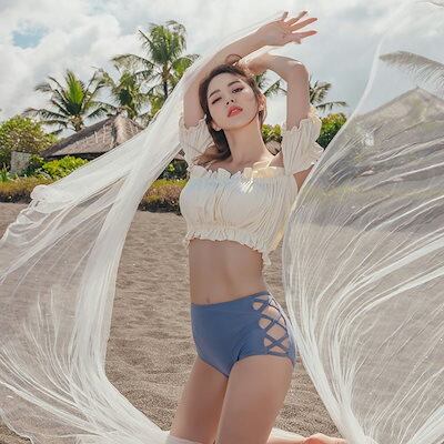 水着ふわふわバンドゥビキニが可愛い韓国レトロ水着 スイムウェア 美脚 脚長 スタイルアップ フレンチ 大人女子 ビーチ バックシャン
