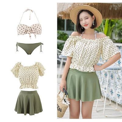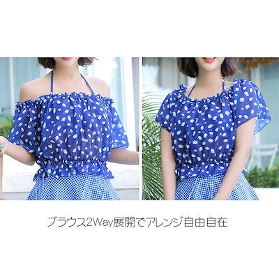 水着 レディース バンドゥ ビキニ トップス オフショルダー ホルダーネック スカート付き 紐パン 透け感あり 4点セット 水玉 チェック カーキ ベージュ ブルー S/M/L/LL
