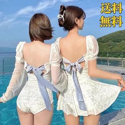 水着 レディース 体型カバー 水着ワンピース型 白レース リボン サロペット水着 半袖/長袖 モノキニビキニ 小胸バンドゥオシャレ韓国風 可愛い スイムウェア