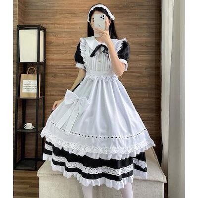 メイド服 メイドコス ハロウィン メイドコスプレ衣装 長袖 半袖 ロング丈 ショート丈 かわいい ロリータドレス エプロンドレス レース 裾フリル 大きい