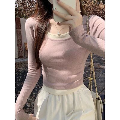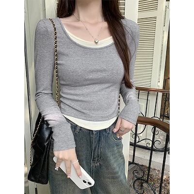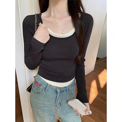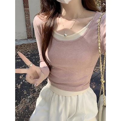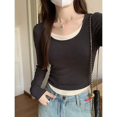 Uネックフェイクツーピース長袖Tシャツ 女性用アシンメトリーカラーブロックスリムインナー