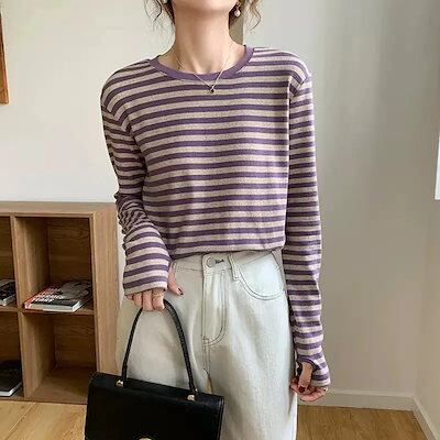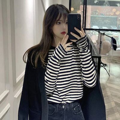 ストライプインナーロングスリーブ韓国風カラーブロックルーズTシャツトップス