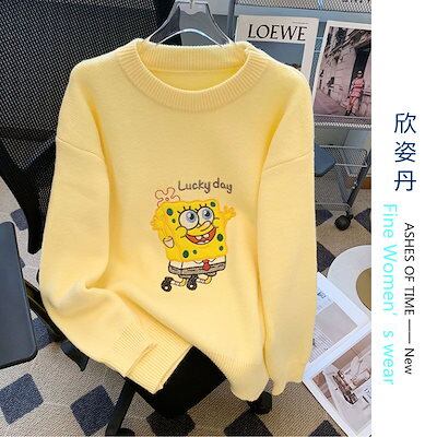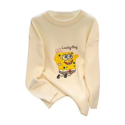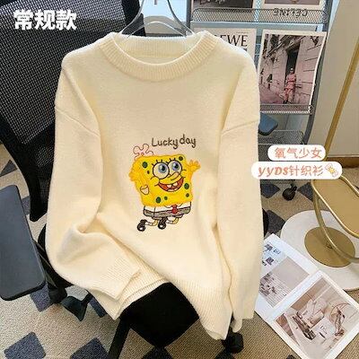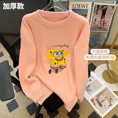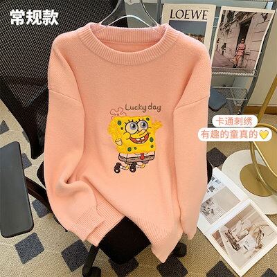 ゆったりとした厚さ秋冬趣味漫画スポンジボブ刺繍ニットの中の長いタイプの怠惰な長袖セーター女性 Tシャツ カットソー