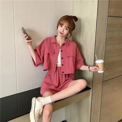 韓国ファッション セットアップ レディースワークスーツ韓国風夏ファッションゆったり学生服ショートパンツ2点セット 涼しく楽ちんセットアップ