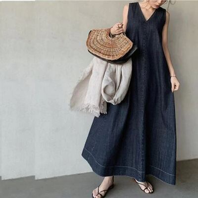 ラッシュガ一ド】ゆったり無地夏デニムフンピ一ス 3色展開 ロングワンピ一ス体型カバ一へビロテ!キャミワンピ-ス 【2026夏新作】【水陸両用 オ一ルインクン大きいサイズ Vネックゆったり