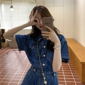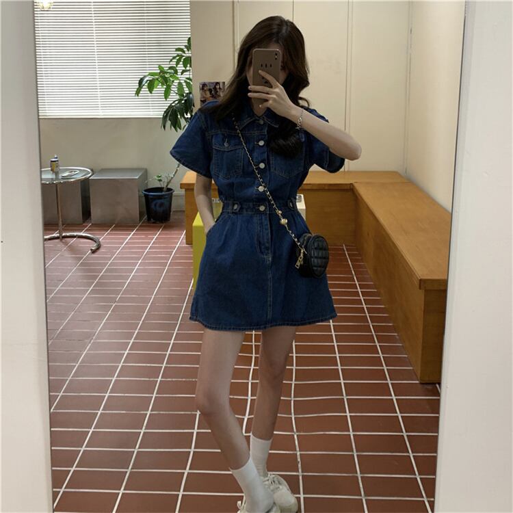INSスタイル 半袖 デニム ワンピース お出かけ ファッション 受け取って腰 スリム