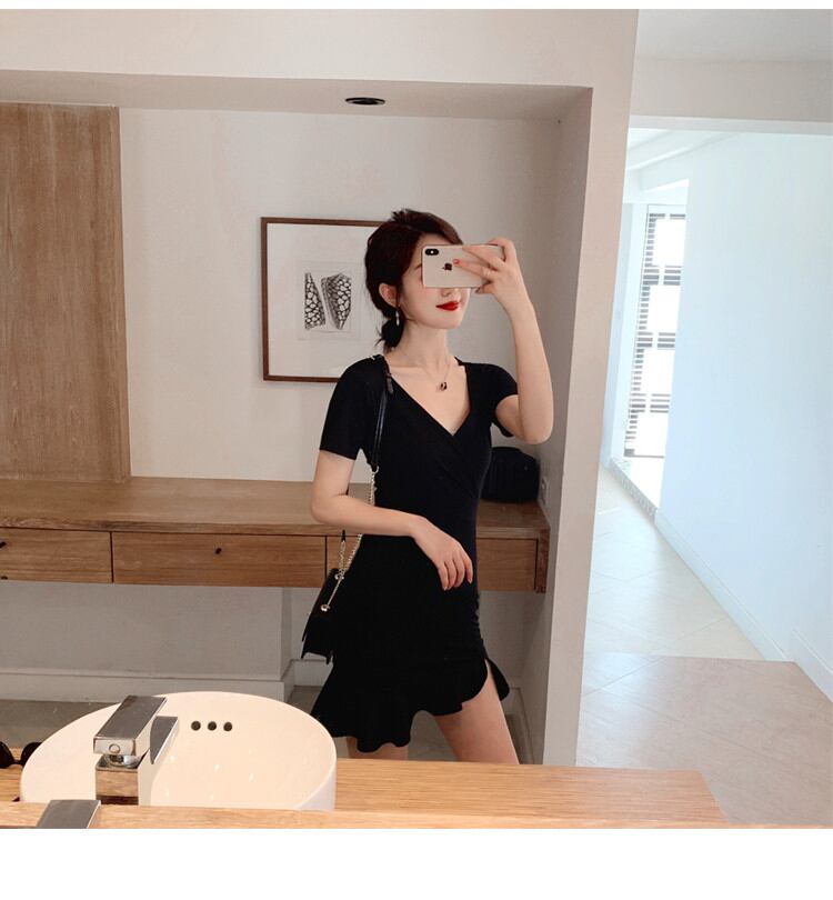 セクシー スプリット フィッシュテール バッグヒップ Vネック半袖 ワンピース 気質