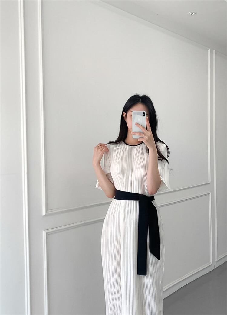 通勤する 気質 エレガント 簡約 ラウンドネック プリーツ バンディング 半袖 ワンピース