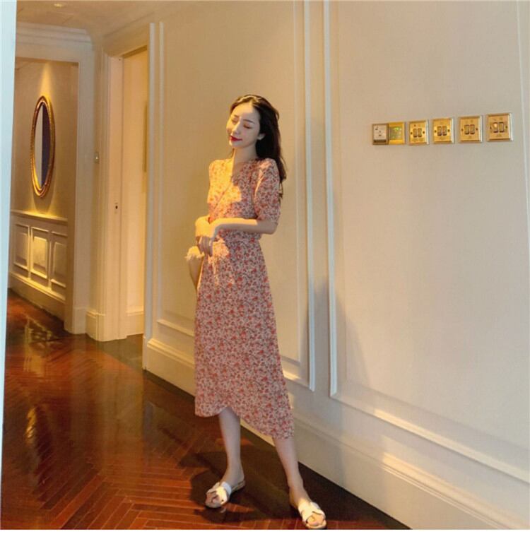 シフォン 花柄 Vネック 半袖 ワンピース イレギュラー 中・長セクション スリム
