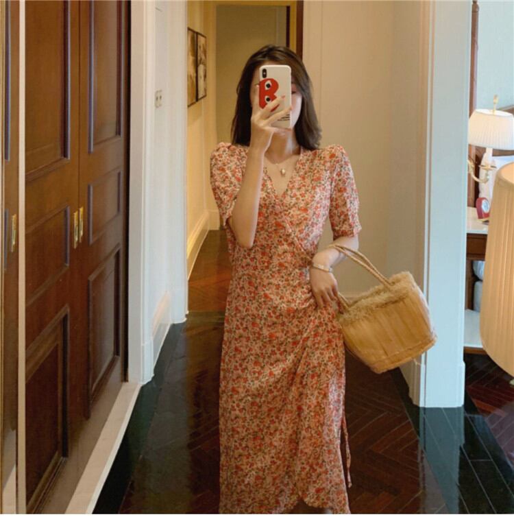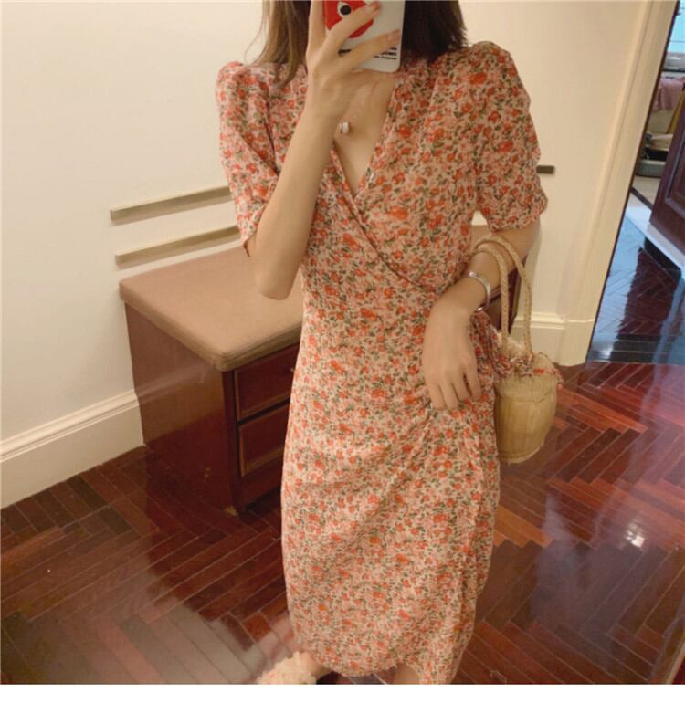 シフォン 花柄 Vネック 半袖 ワンピース イレギュラー 中・長セクション スリム